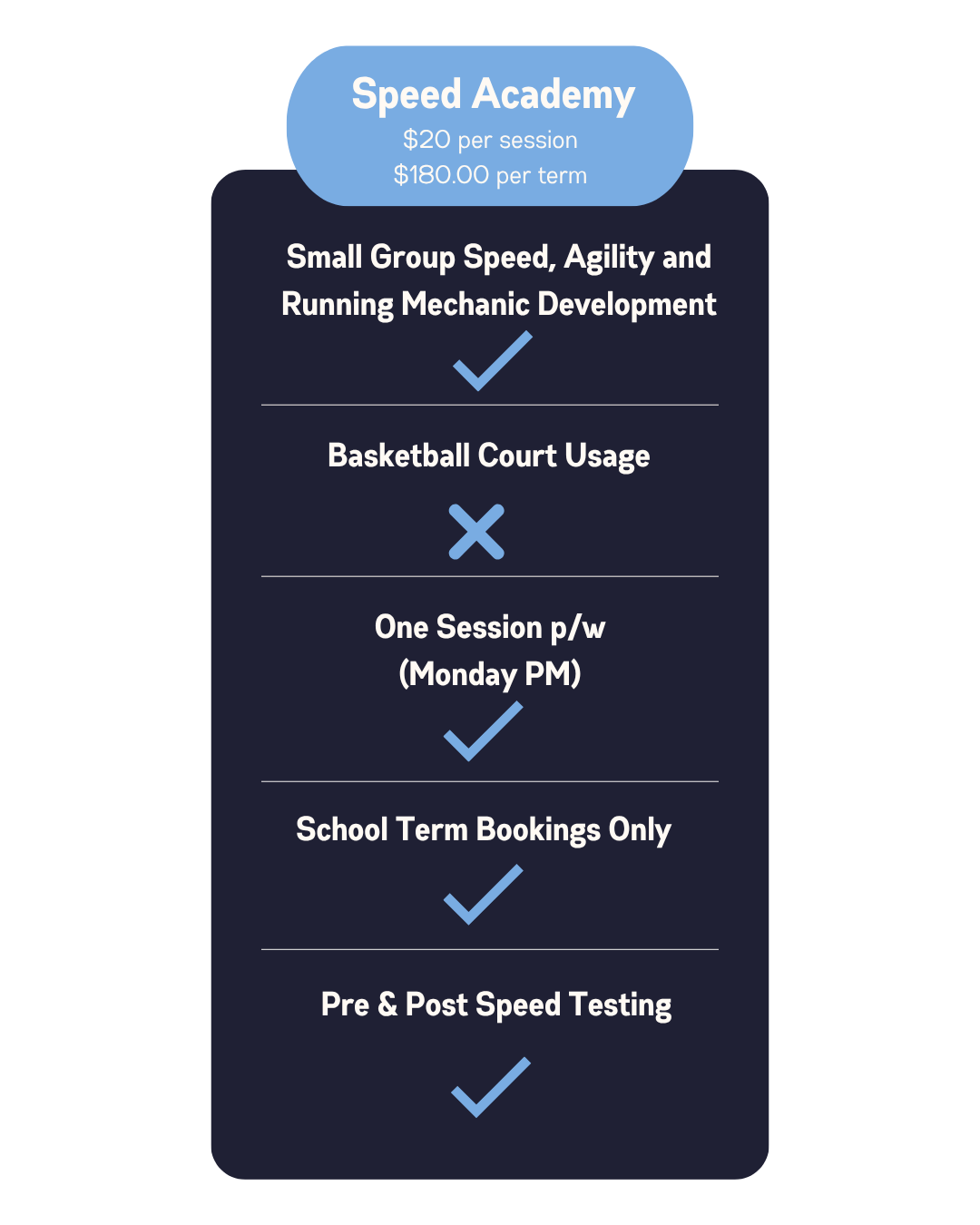 We measure each athlete at the start and end of their 10 week block to help quantify and track their progress and growth. Your child may start at any time throughout the year for our regular junior academy. The speed academy runs in line with the school term. Please see below for the next available speed academy intake.